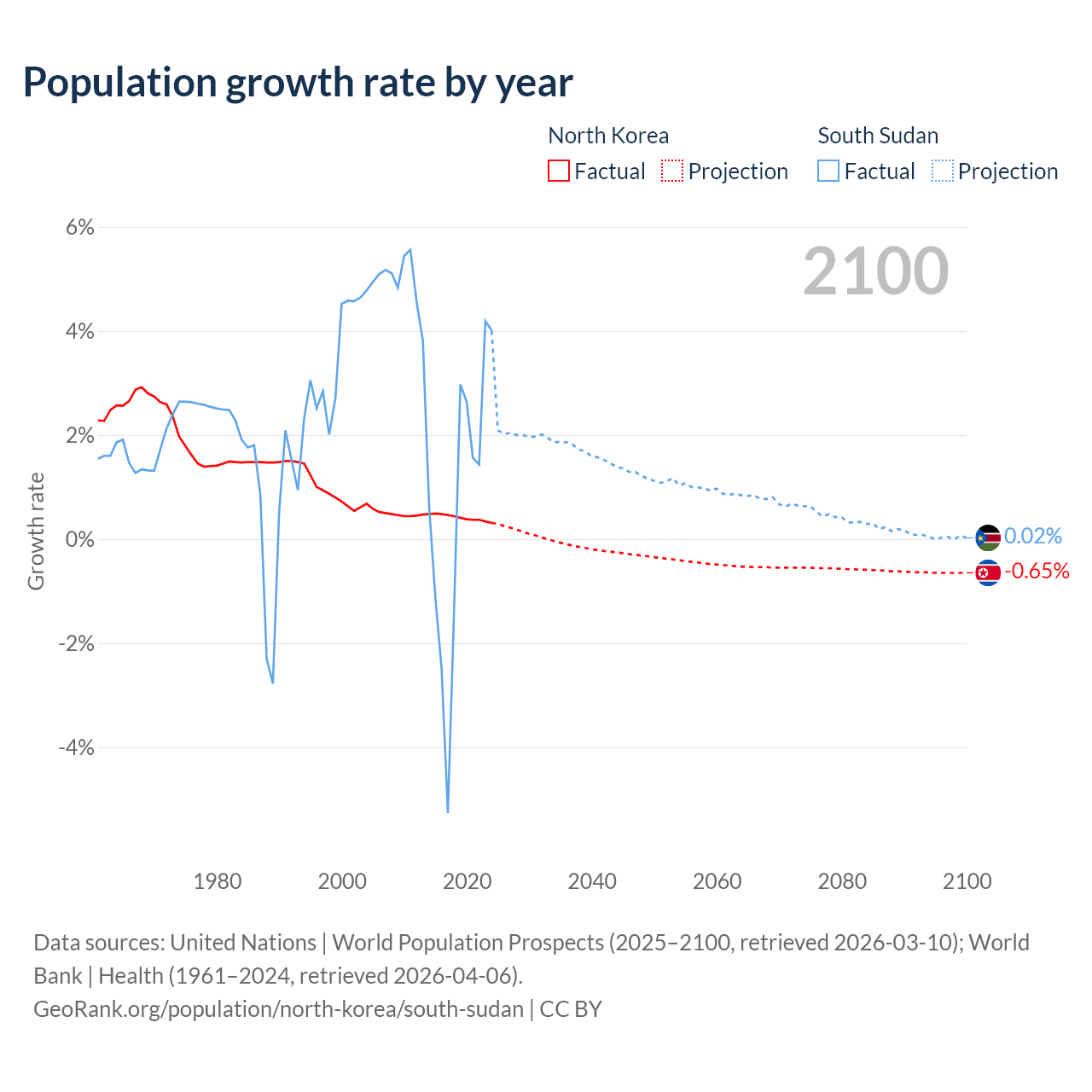 - For the last 10 years, North Korea has had an average growth rate of +0.41% per year vs +0.65% in South Sudan.