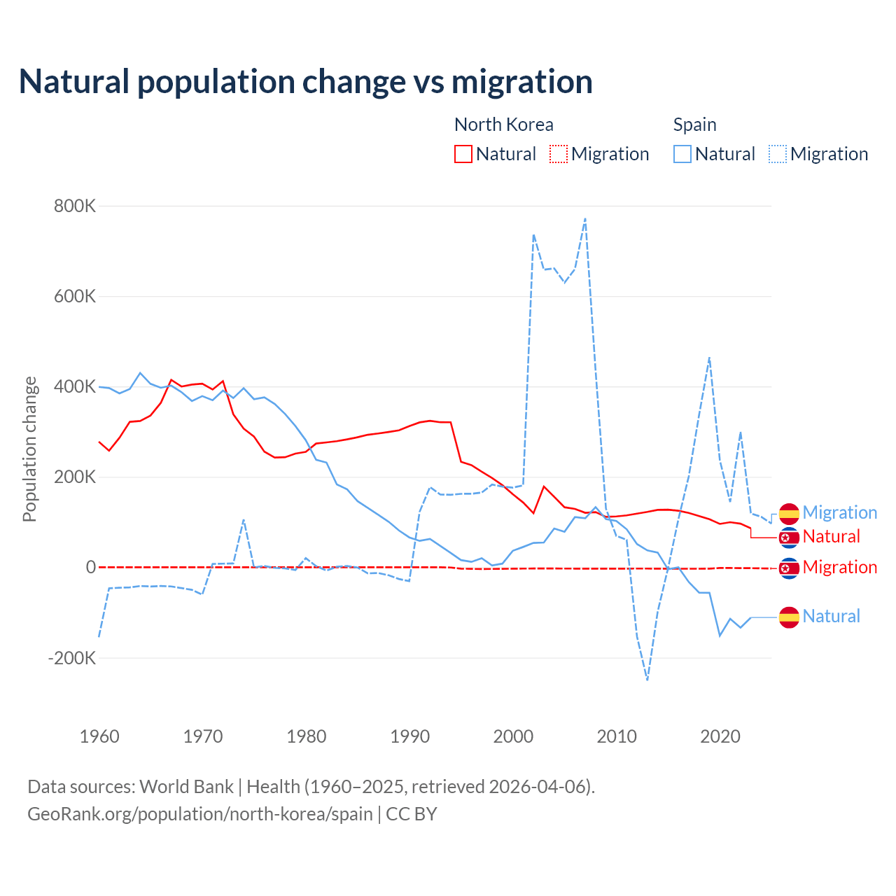 Over the last 10 years, 97.7% of the population change in North Korea is from natural causes (a gain of 1,097,372 people) and 2.33% is from migration (a loss of 26,227 people). In Spain 25.8% is from natural causes (a loss of 627,829 people) and 74.2% is from migration (a gain of 1,810,127 people).