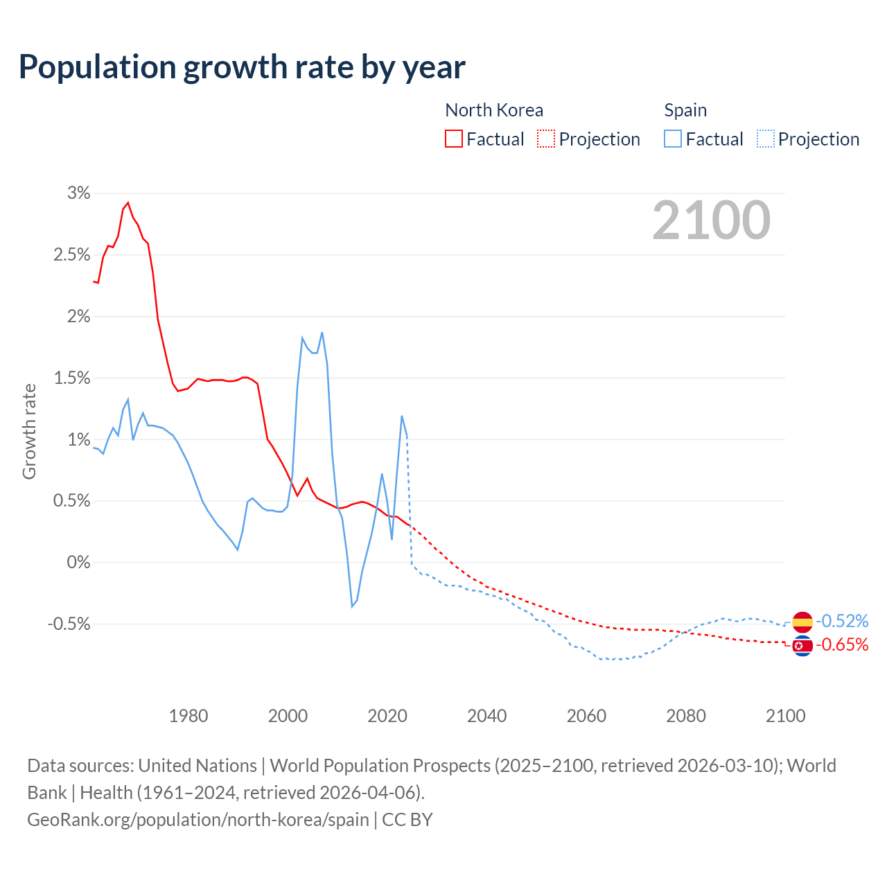 - For the last 10 years, North Korea has had an average growth rate of +0.41% per year vs +0.43% in Spain.