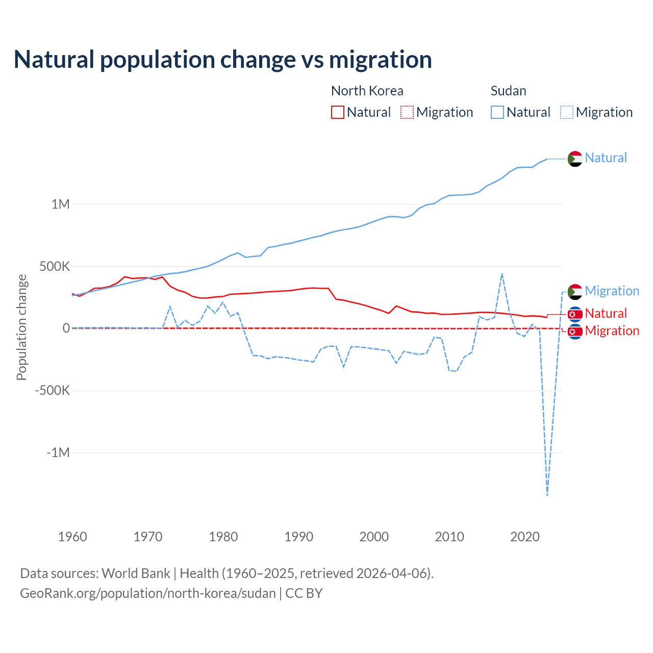 Over the last 10 years, 97.7% of the population change in North Korea is from natural causes (a gain of 1,097,372 people) and 2.33% is from migration (a loss of 26,227 people). In Sudan 95.1% is from natural causes (a gain of 12,459,977 people) and 4.88% is from migration (a loss of 639,596 people).