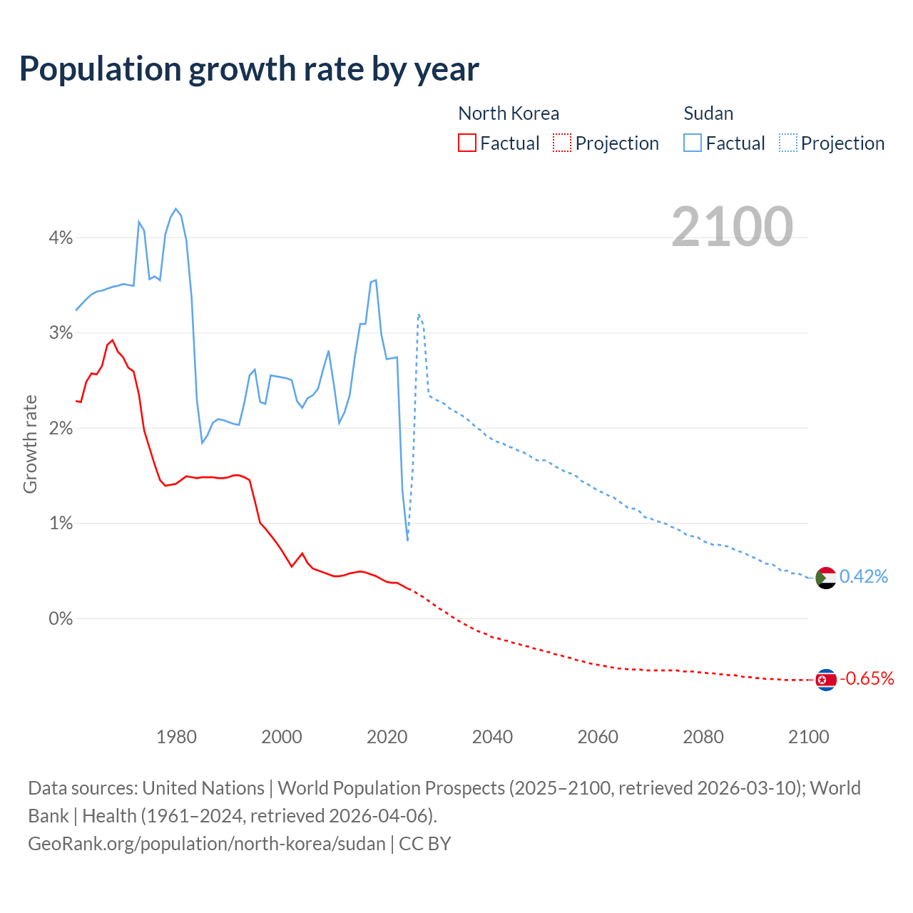 - For the last 10 years, North Korea has had an average growth rate of +0.41% per year vs +2.67% in Sudan.