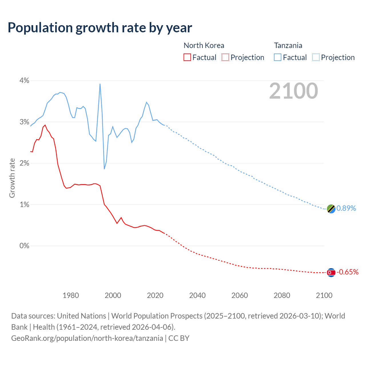 - For the last 10 years, North Korea has had an average growth rate of +0.41% per year vs +3.13% in Tanzania.