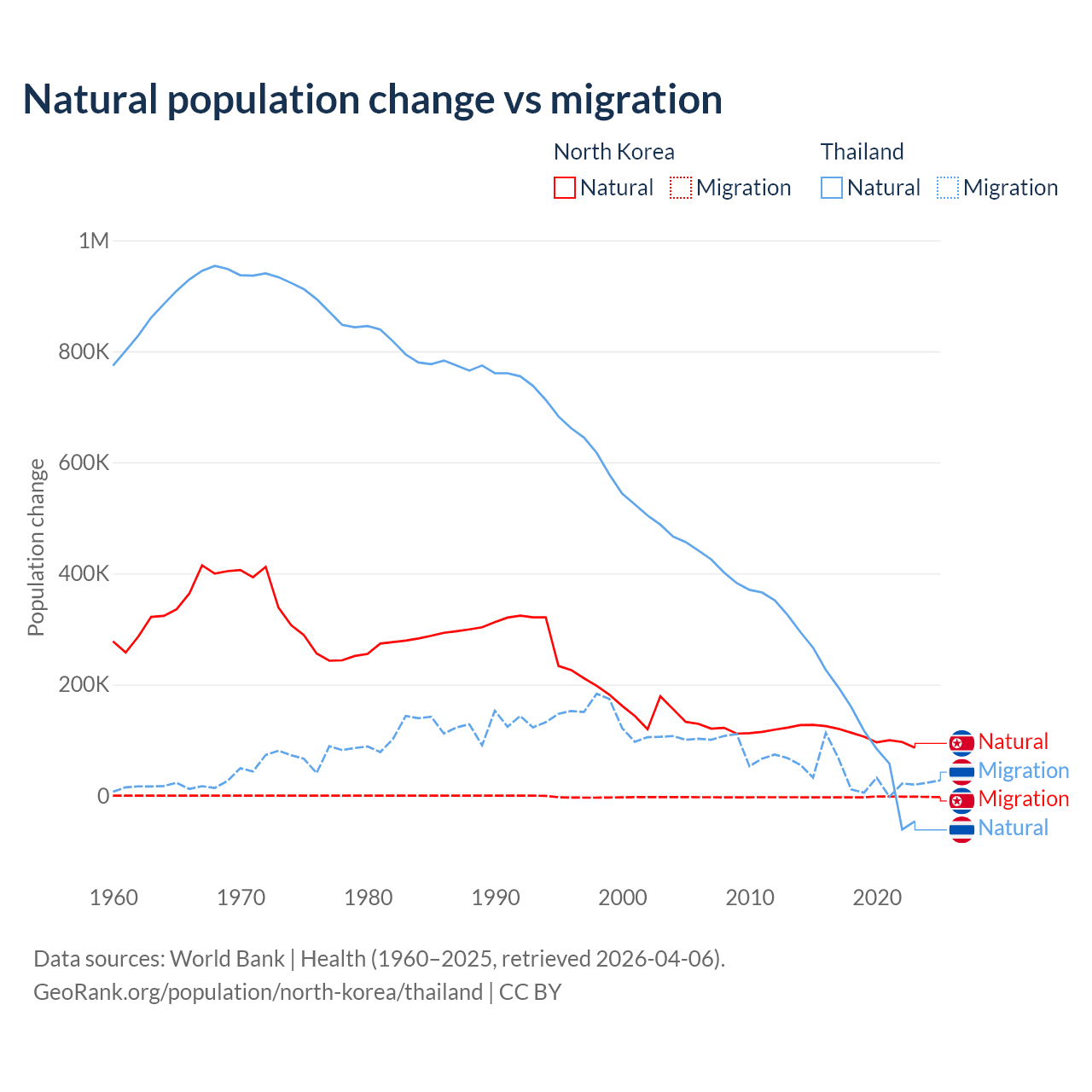 Over the last 10 years, 97.7% of the population change in North Korea is from natural causes (a gain of 1,097,372 people) and 2.33% is from migration (a loss of 26,227 people). In Thailand 78.4% is from natural causes (a gain of 1,292,528 people) and 21.6% is from migration (a gain of 355,361 people).