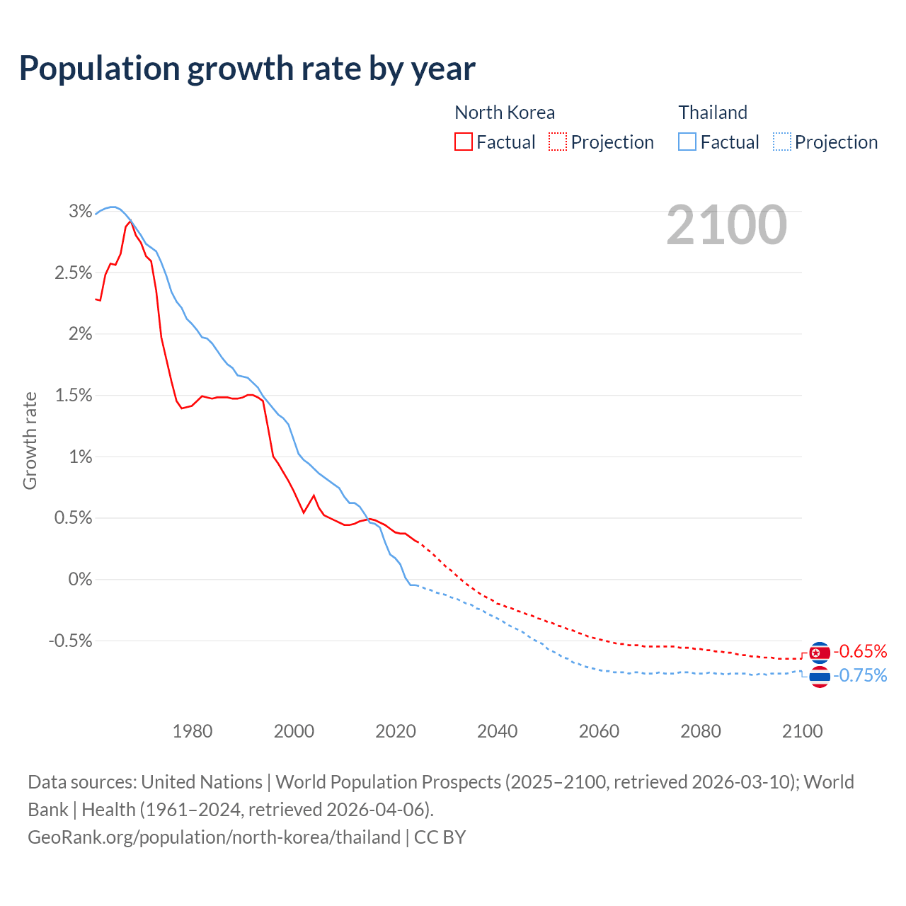 - For the last 10 years, North Korea has had an average growth rate of +0.41% per year vs +0.23% in Thailand.