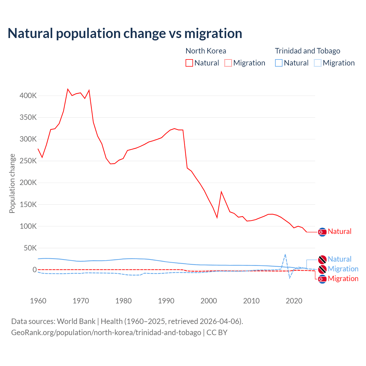 Over the last 10 years, 97.7% of the population change in North Korea is from natural causes (a gain of 1,097,372 people) and 2.33% is from migration (a loss of 26,227 people). In Trinidad and Tobago 66% is from natural causes (a gain of 55,887 people) and 34% is from migration (a gain of 28,785 people).