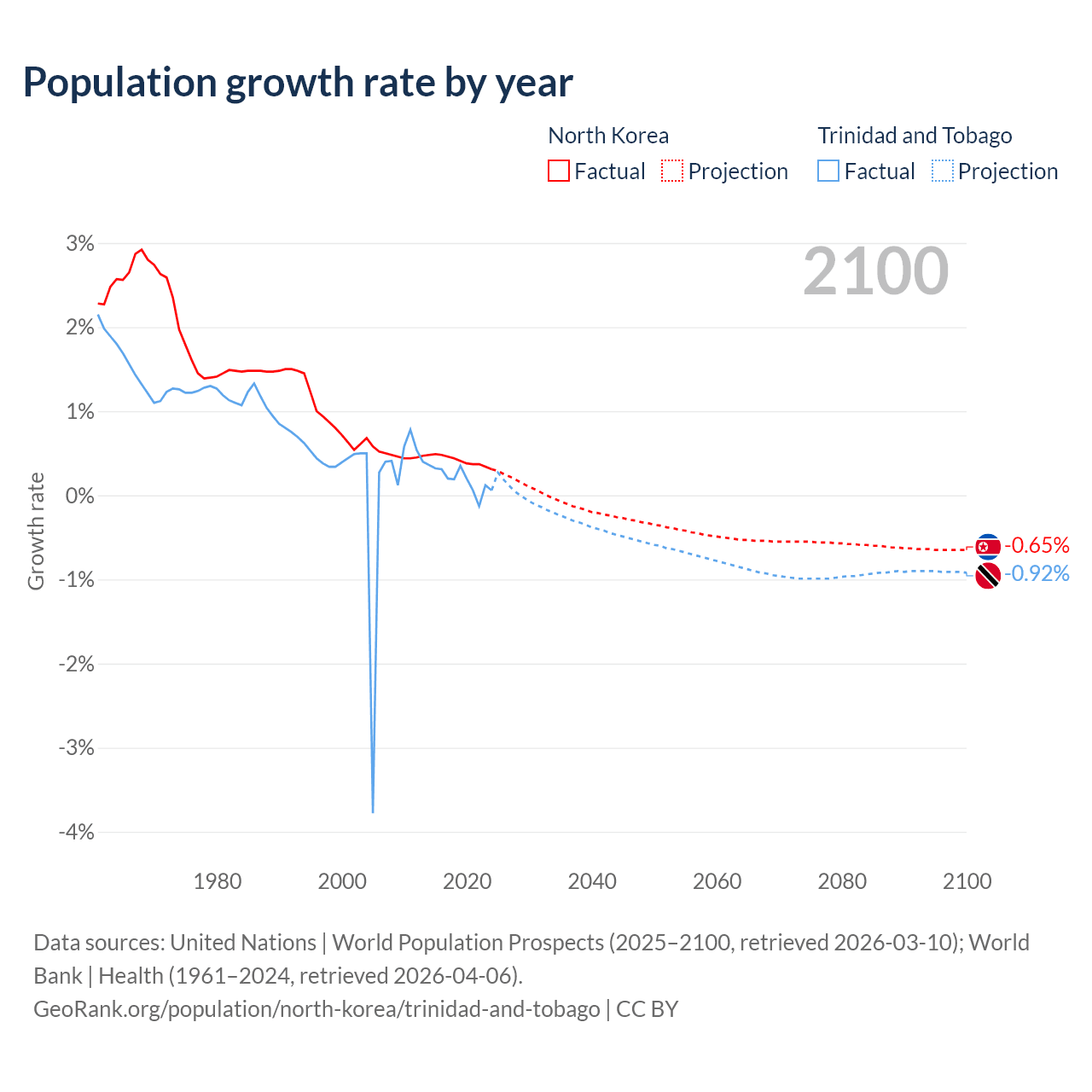 - For the last 10 years, North Korea has had an average growth rate of +0.41% per year vs +0.19% in Trinidad and Tobago.