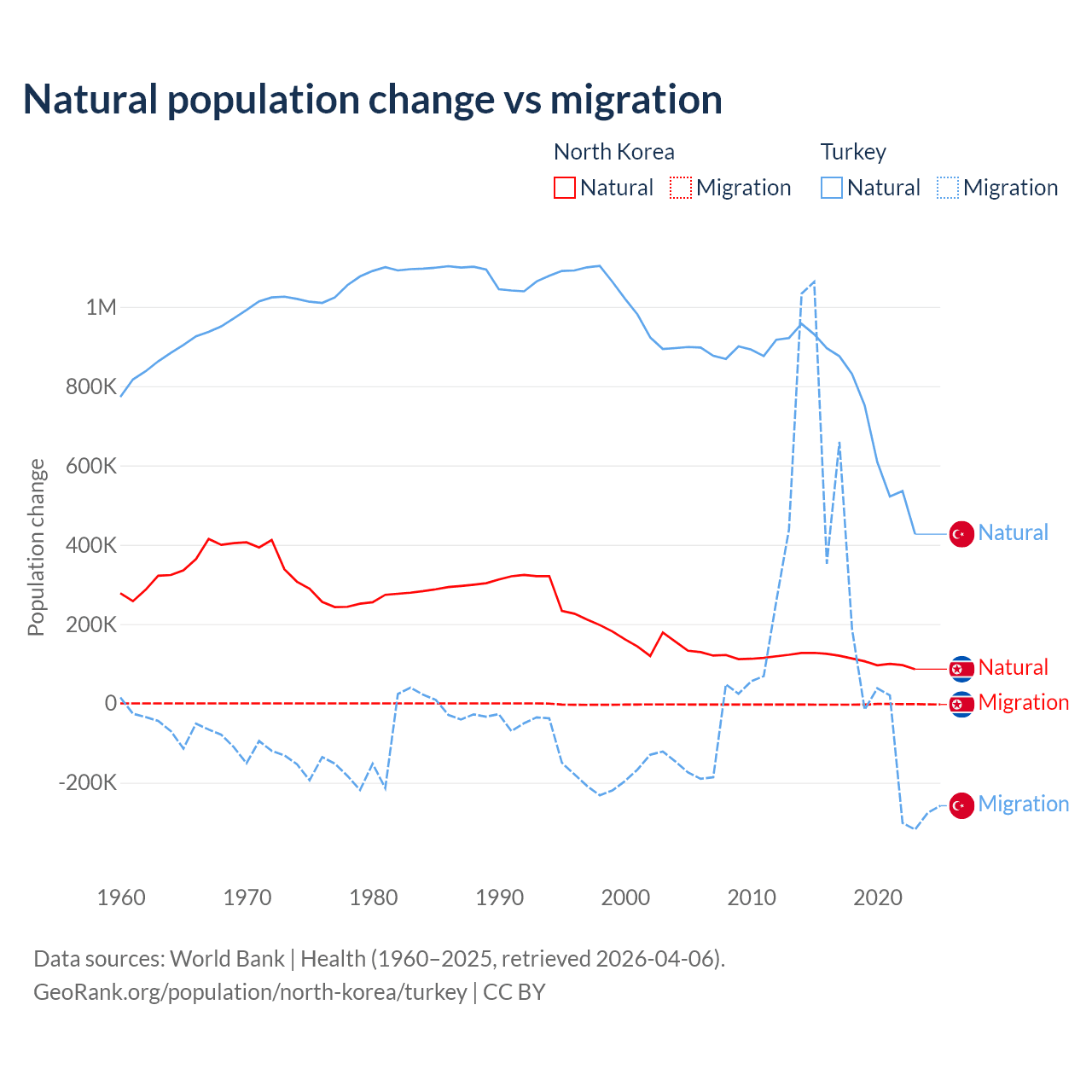 Over the last 10 years, 97.7% of the population change in North Korea is from natural causes (a gain of 1,097,372 people) and 2.33% is from migration (a loss of 26,227 people). In Turkey 73% is from natural causes (a gain of 7,333,352 people) and 27% is from migration (a gain of 2,718,916 people).