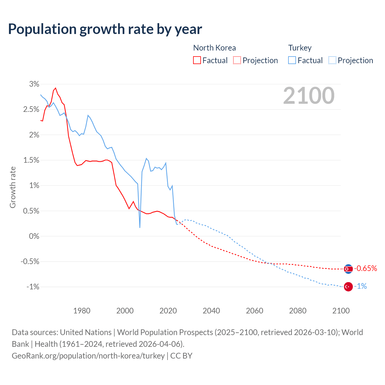 - For the last 10 years, North Korea has had an average growth rate of +0.41% per year vs +1.06% in Turkey.
