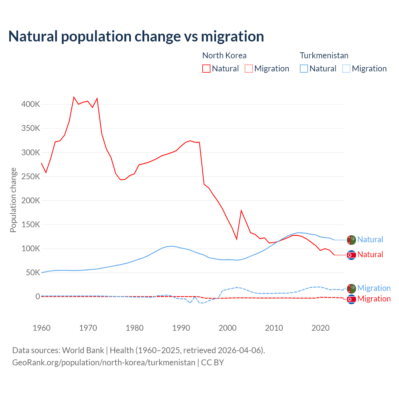 Over the last 10 years, 97.7% of the population change in North Korea is from natural causes (a gain of 1,097,372 people) and 2.33% is from migration (a loss of 26,227 people). In Turkmenistan 89.2% is from natural causes (a gain of 1,270,228 people) and 10.8% is from migration (a gain of 154,379 people).