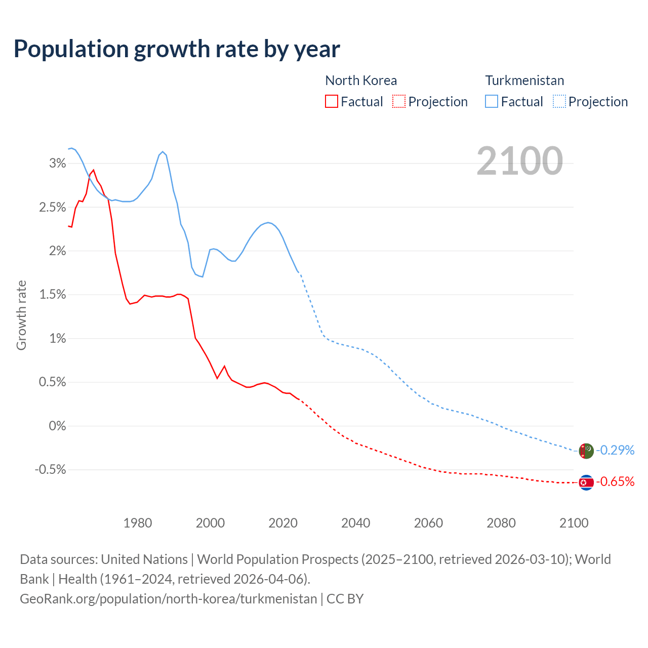 - For the last 10 years, North Korea has had an average growth rate of +0.41% per year vs +2.14% in Turkmenistan.