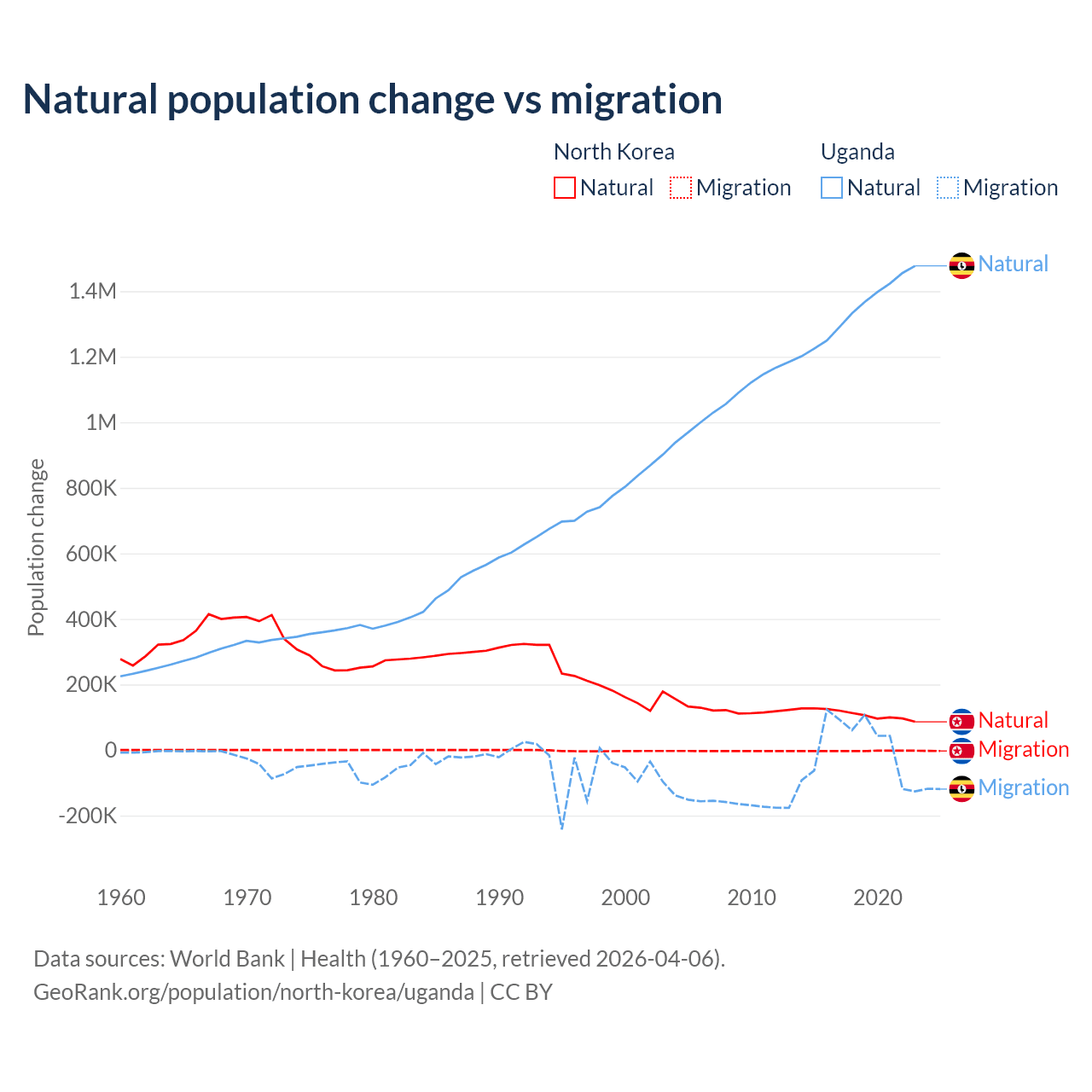 Over the last 10 years, 97.7% of the population change in North Korea is from natural causes (a gain of 1,097,372 people) and 2.33% is from migration (a loss of 26,227 people). In Uganda 99.5% is from natural causes (a gain of 13,419,712 people) and 0.53% is from migration (a gain of 71,457 people).