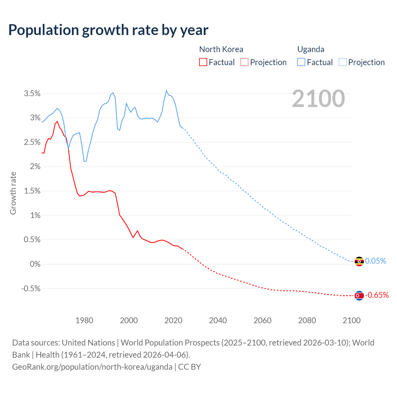 - For the last 10 years, North Korea has had an average growth rate of +0.41% per year vs +3.21% in Uganda.