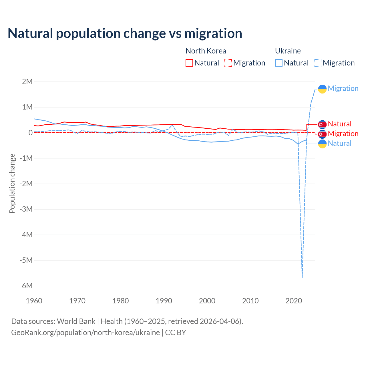 Over the last 10 years, 97.7% of the population change in North Korea is from natural causes (a gain of 1,097,372 people) and 2.33% is from migration (a loss of 26,227 people). In Ukraine 28.2% is from natural causes (a loss of 2,435,153 people) and 71.8% is from migration (a loss of 6,198,995 people).