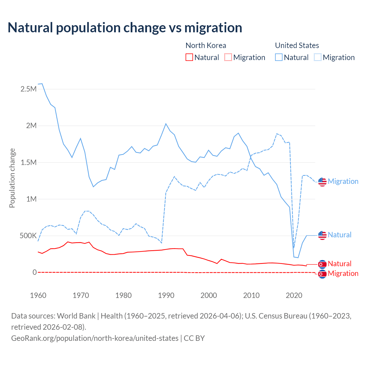 Over the last 10 years, 97.7% of the population change in North Korea is from natural causes (a gain of 1,097,372 people) and 2.33% is from migration (a loss of 26,227 people). In the United States 35.8% is from natural causes (a gain of 8,005,866 people) and 64.2% is from migration (a gain of 14,334,286 people).