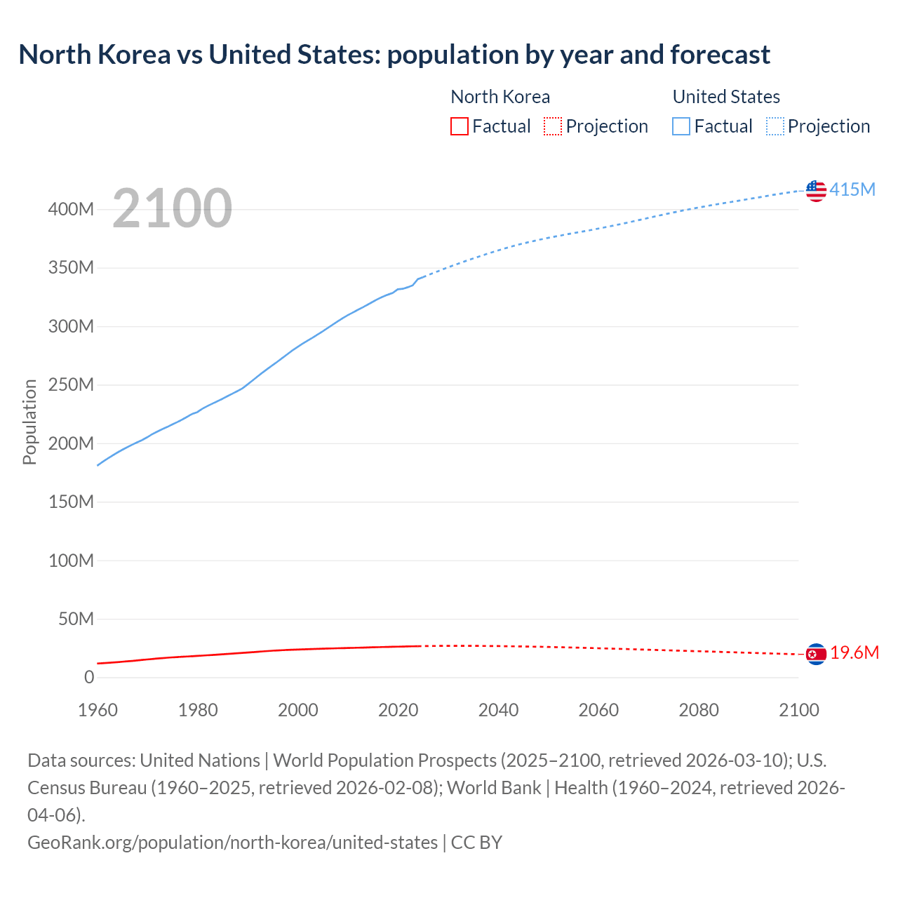 The latest officially reported population of North Korea was 26,498,823 in 2024 vs 341,784,857 people in the United States in 2025. In 2026, based on the adjusted UN estimation, the current North Korea's population is 26,659,144 people compared to 344,023,146 in the United States.