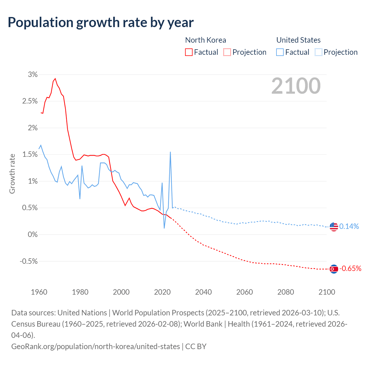 - For the last 10 years, North Korea has had an average growth rate of +0.41% per year vs +0.65% in the United States.