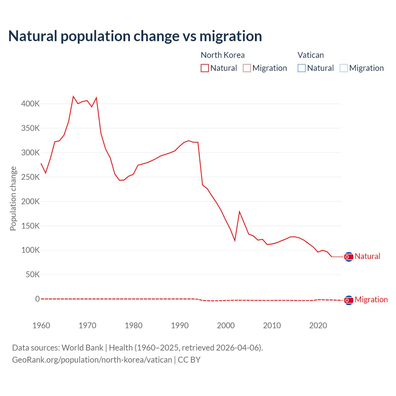 - For the last 10 years, North Korea has had an average growth rate of +0.41% per year vs +1.9% in the Vatican.