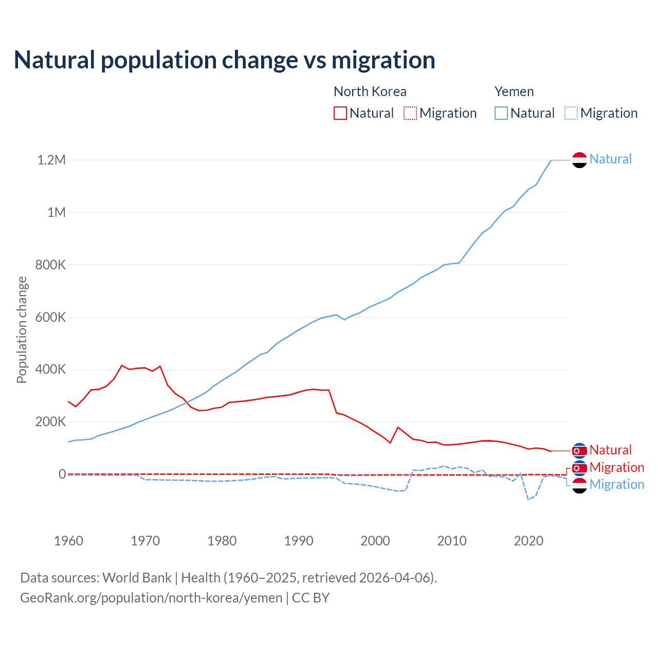 Over the last 10 years, 97.7% of the population change in North Korea is from natural causes (a gain of 1,097,372 people) and 2.33% is from migration (a loss of 26,227 people). In Yemen 97.8% is from natural causes (a gain of 10,460,813 people) and 2.17% is from migration (a loss of 231,814 people).