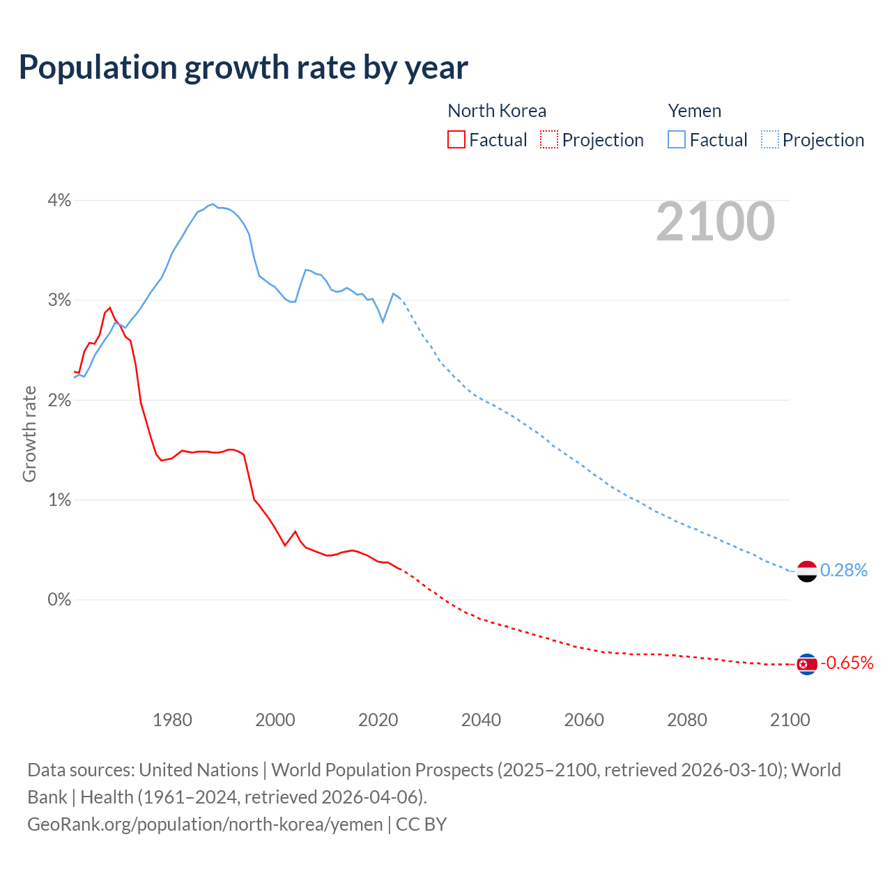 - For the last 10 years, North Korea has had an average growth rate of +0.41% per year vs +3% in Yemen.