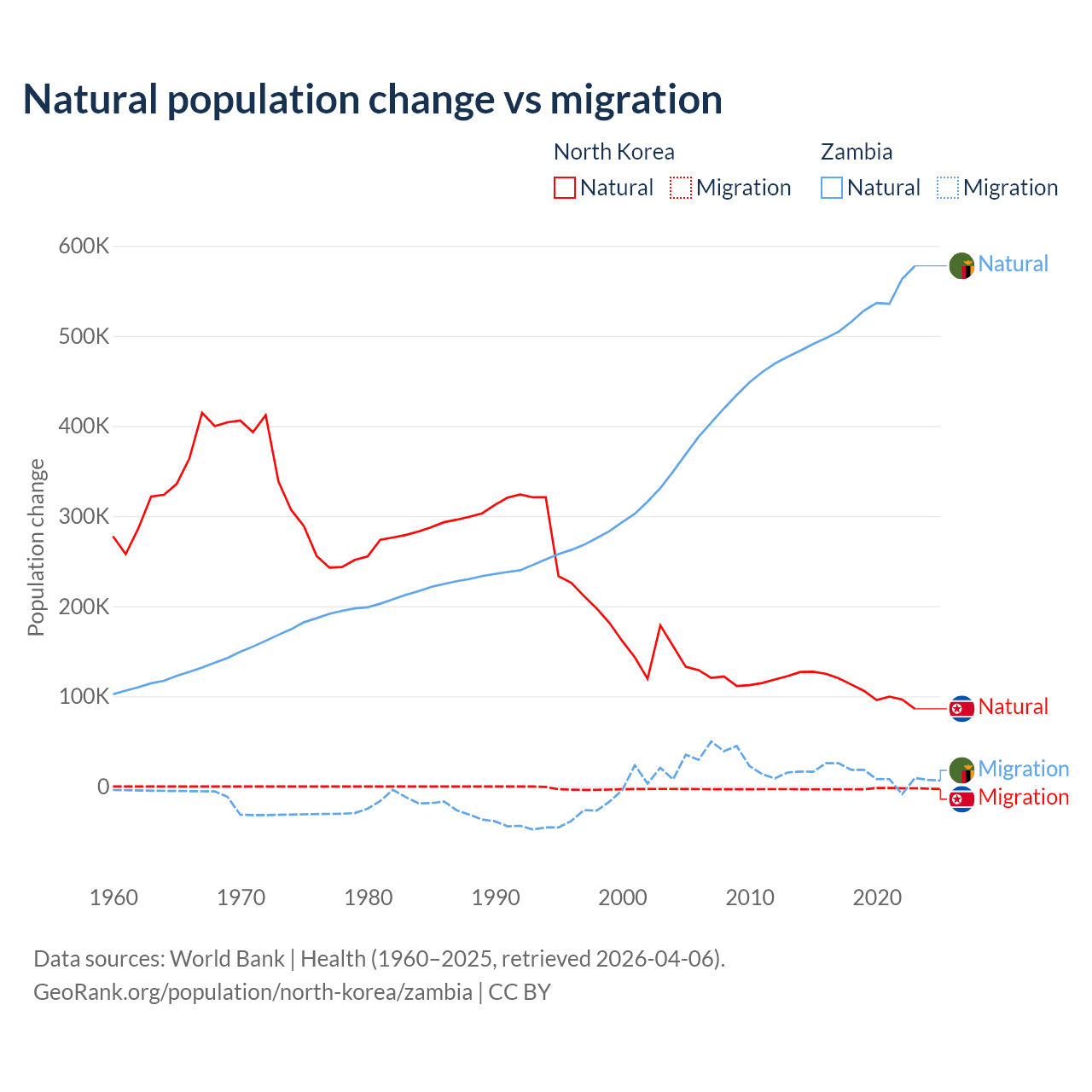 Over the last 10 years, 97.7% of the population change in North Korea is from natural causes (a gain of 1,097,372 people) and 2.33% is from migration (a loss of 26,227 people). In Zambia 97.4% is from natural causes (a gain of 5,233,797 people) and 2.58% is from migration (a gain of 138,554 people).