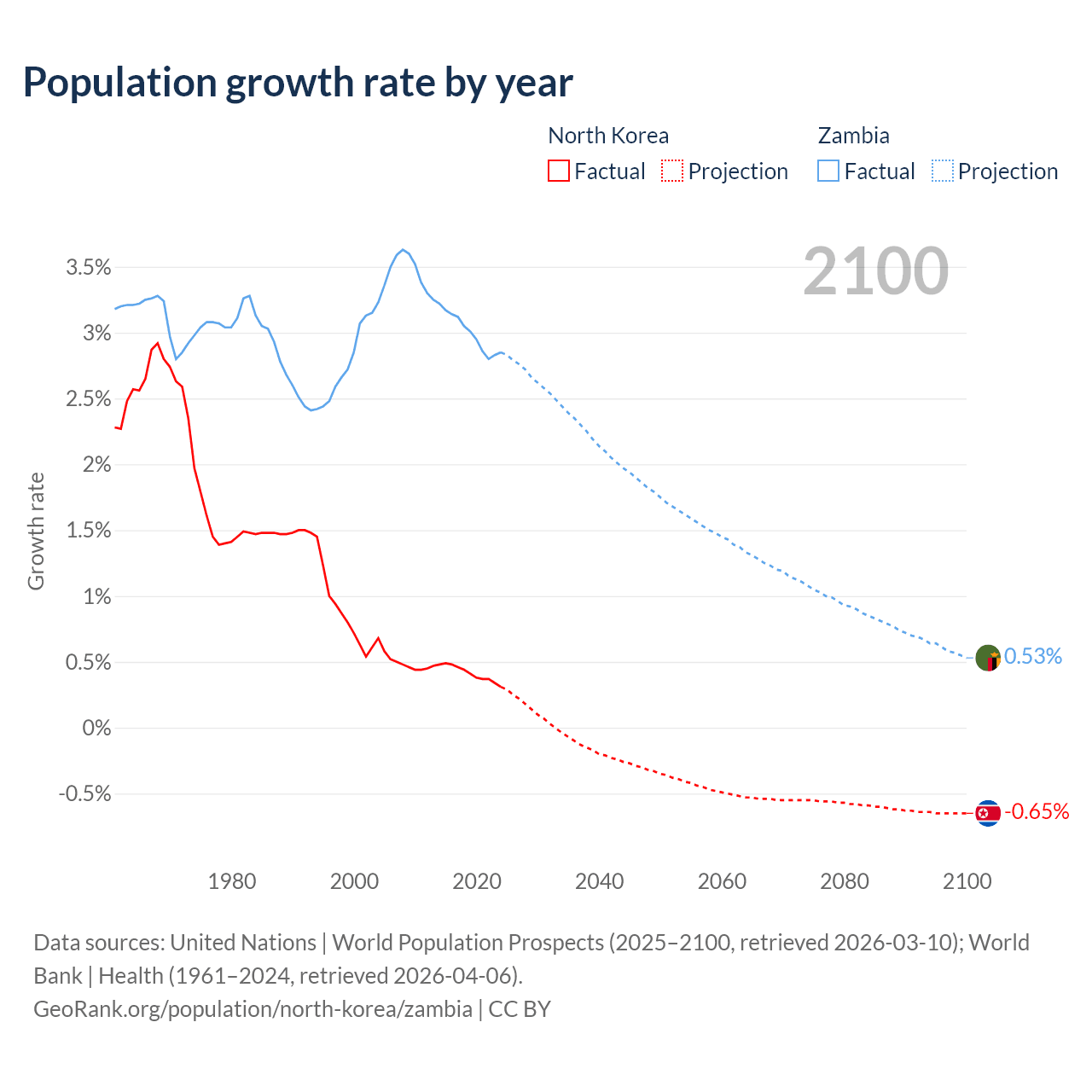 - For the last 10 years, North Korea has had an average growth rate of +0.41% per year vs +3% in Zambia.