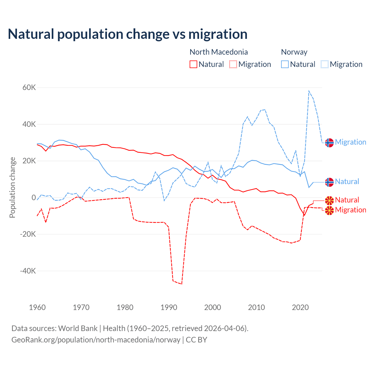 Over the last 10 years, 6.45% of the population change in North Macedonia is from natural causes (a loss of 12,585 people) and 93.5% is from migration (a loss of 182,429 people). In Norway 31.3% is from natural causes (a gain of 138,699 people) and 68.7% is from migration (a gain of 303,945 people).
