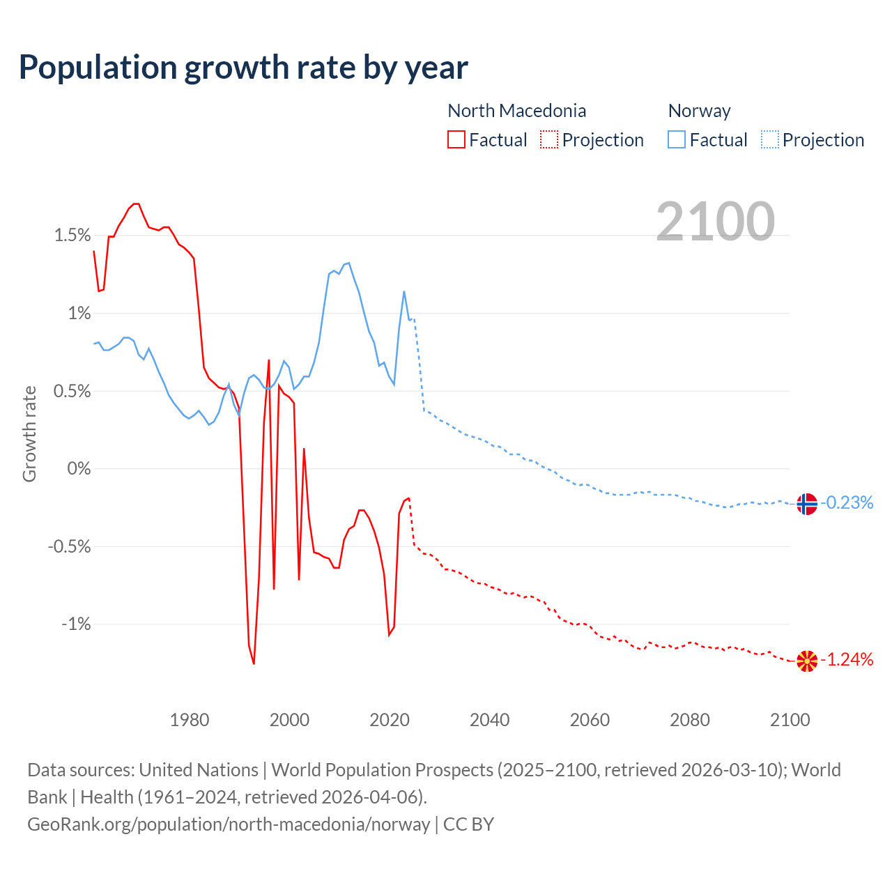 - For the last 10 years, North Macedonia has had an average growth rate of -0.48% per year vs +0.85% in Norway.