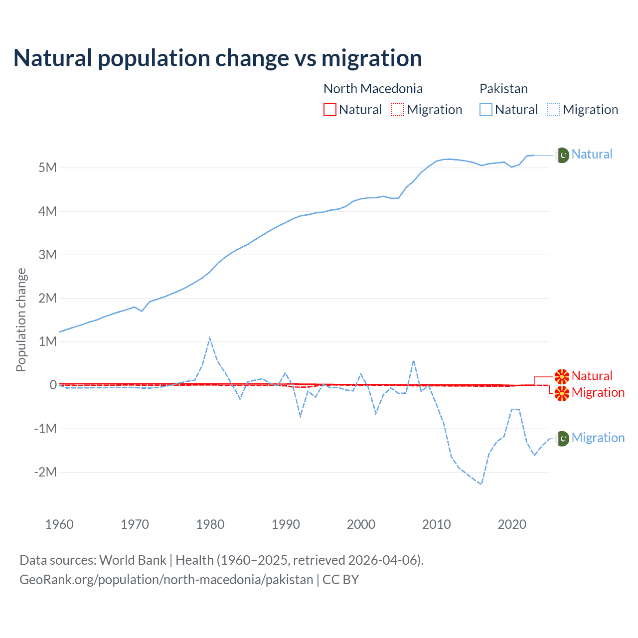 Over the last 10 years, 6.45% of the population change in North Macedonia is from natural causes (a loss of 12,585 people) and 93.5% is from migration (a loss of 182,429 people). In Pakistan 77.8% is from natural causes (a gain of 51,255,404 people) and 22.2% is from migration (a loss of 14,629,055 people).
