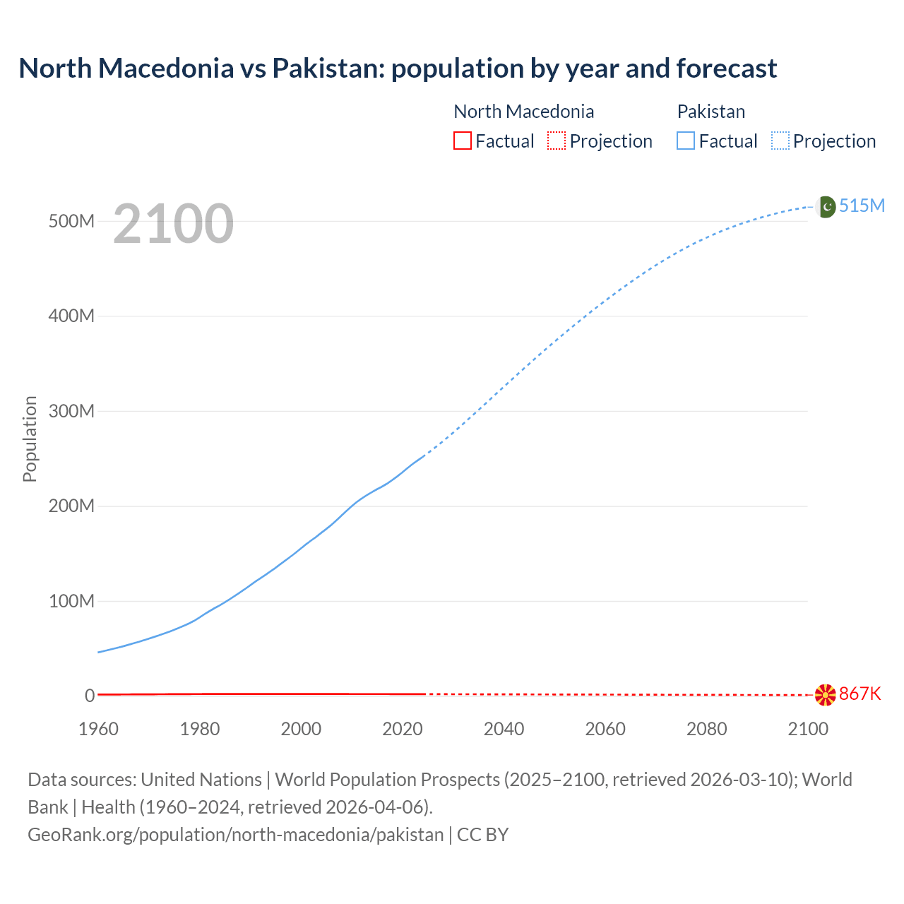 - Since 2006, the population of North Macedonia has decreased from 1.99M people to 1.81M (9.44% decline), while Pakistan has grown from 180M to 260M (44.9% growth).