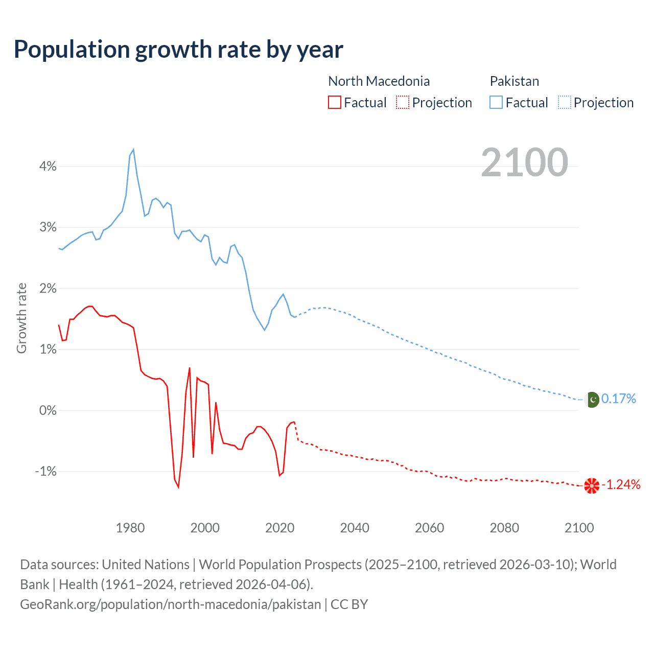 - For the last 10 years, North Macedonia has had an average growth rate of -0.48% per year vs +1.6% in Pakistan.