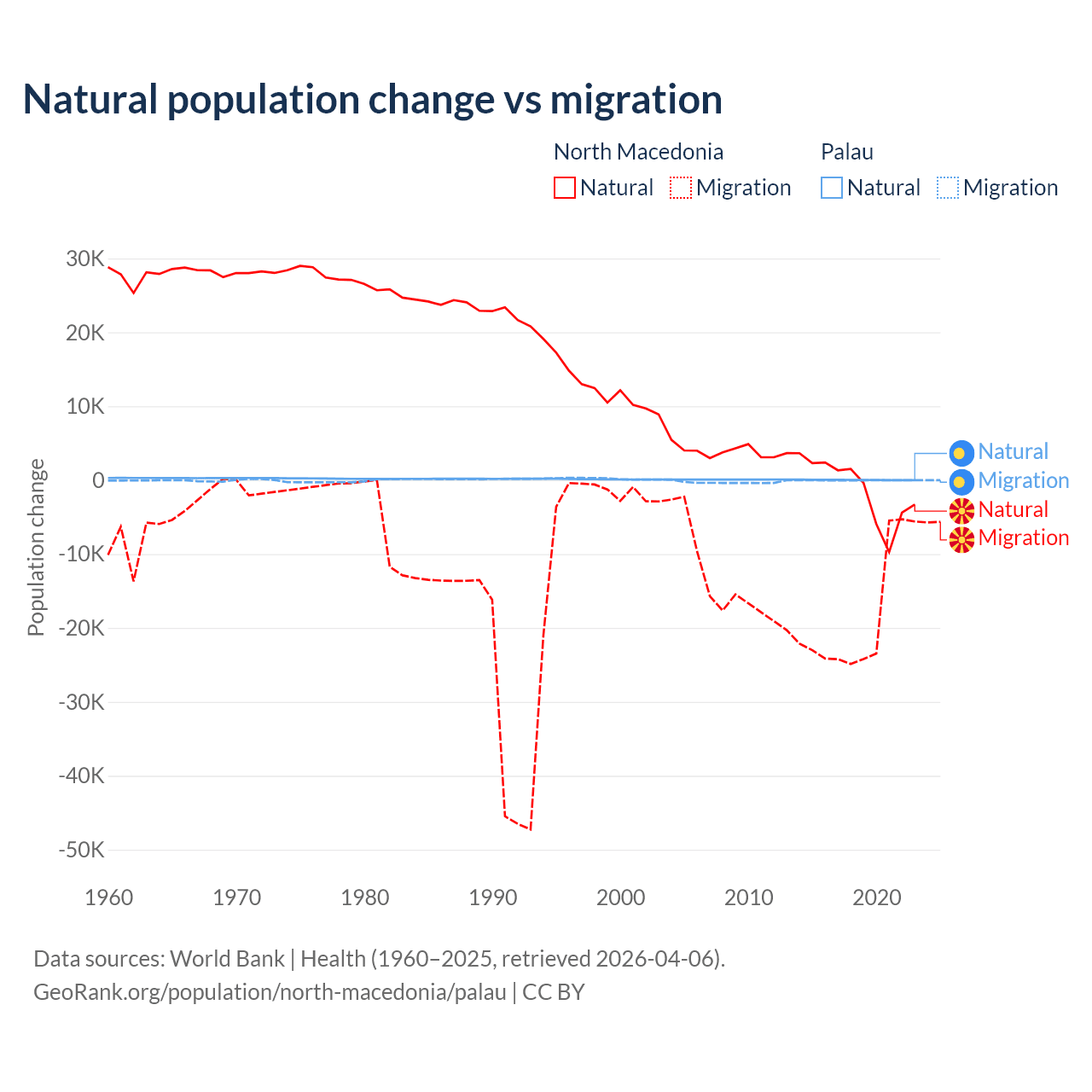 Over the last 10 years, 6.45% of the population change in North Macedonia is from natural causes (a loss of 12,585 people) and 93.5% is from migration (a loss of 182,429 people). In Palau 53.8% is from natural causes (a gain of 264 people) and 46.2% is from migration (a loss of 227 people).