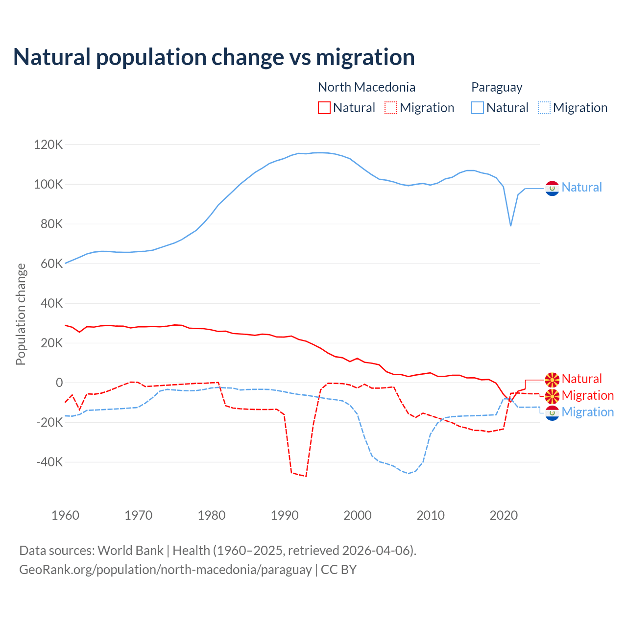 Over the last 10 years, 6.45% of the population change in North Macedonia is from natural causes (a loss of 12,585 people) and 93.5% is from migration (a loss of 182,429 people). In Paraguay 87.6% is from natural causes (a gain of 1,002,636 people) and 12.4% is from migration (a loss of 141,377 people).