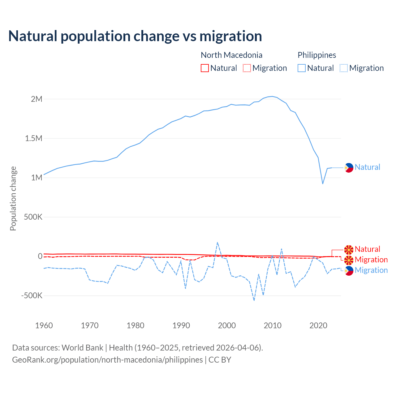 Over the last 10 years, 6.45% of the population change in North Macedonia is from natural causes (a loss of 12,585 people) and 93.5% is from migration (a loss of 182,429 people). In the Philippines 88.5% is from natural causes (a gain of 14,279,705 people) and 11.5% is from migration (a loss of 1,848,117 people).