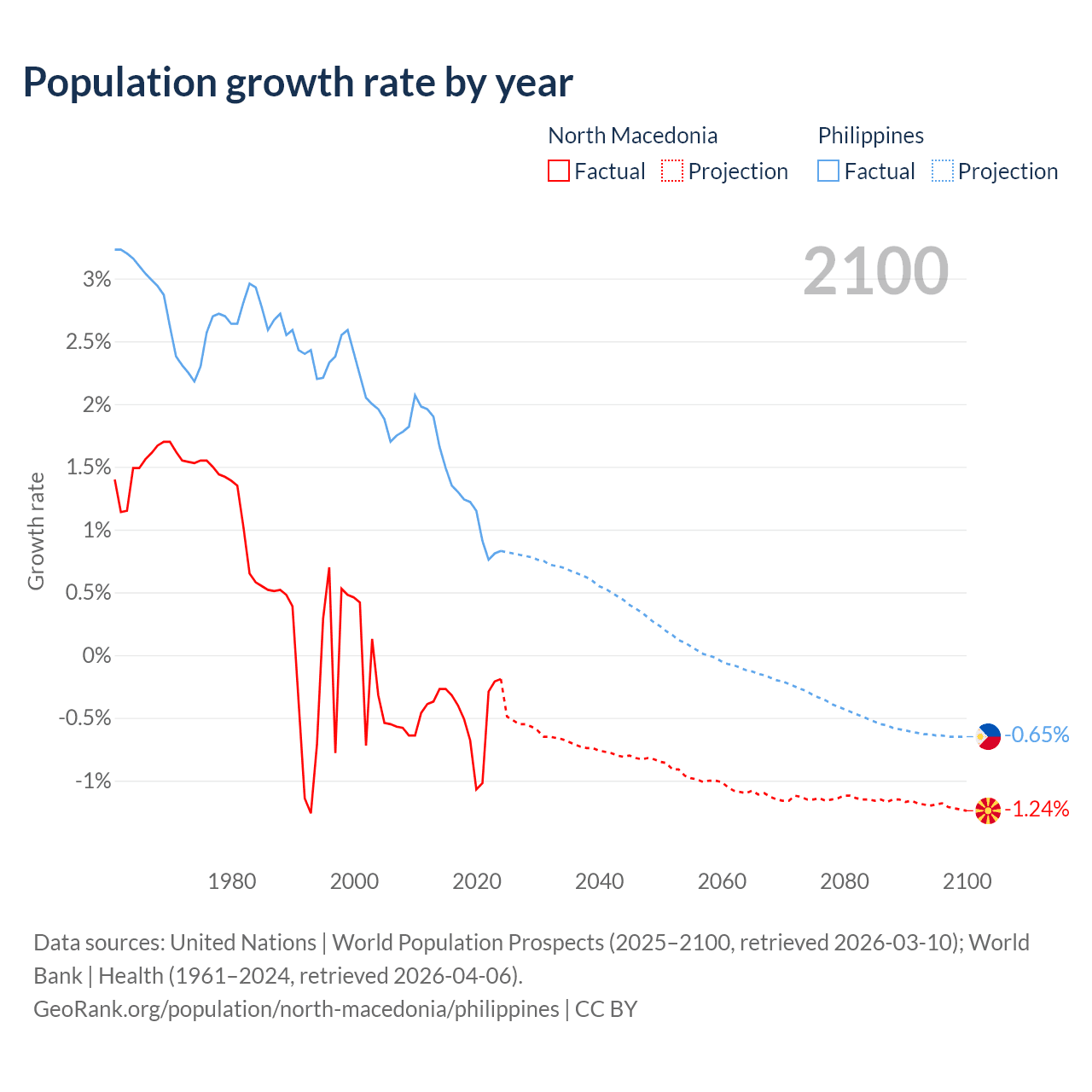 - For the last 10 years, North Macedonia has had an average growth rate of -0.48% per year vs +1.16% in the Philippines.