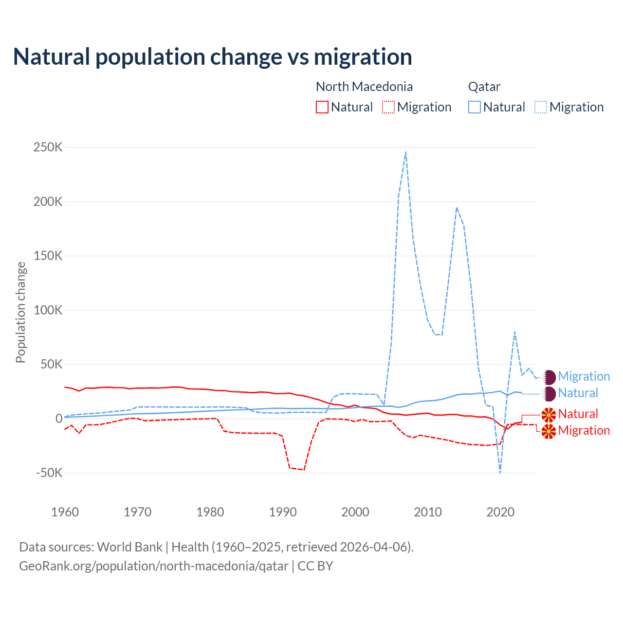 Over the last 10 years, 6.45% of the population change in North Macedonia is from natural causes (a loss of 12,585 people) and 93.5% is from migration (a loss of 182,429 people). In Qatar 26.1% is from natural causes (a gain of 232,009 people) and 73.9% is from migration (a gain of 655,712 people).