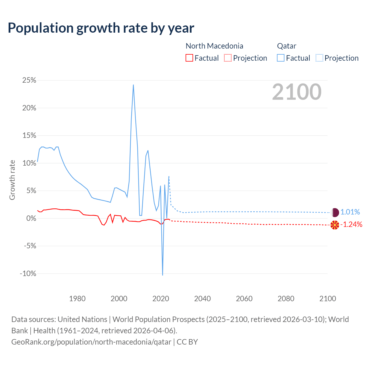 - For the last 10 years, North Macedonia has had an average growth rate of -0.48% per year vs +3.86% in Qatar.