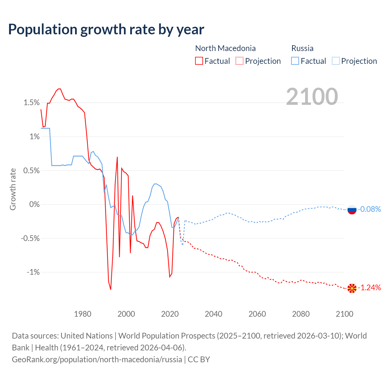 - For the last 10 years, North Macedonia has had an average growth rate of -0.48% per year vs -0.02% in Russia.