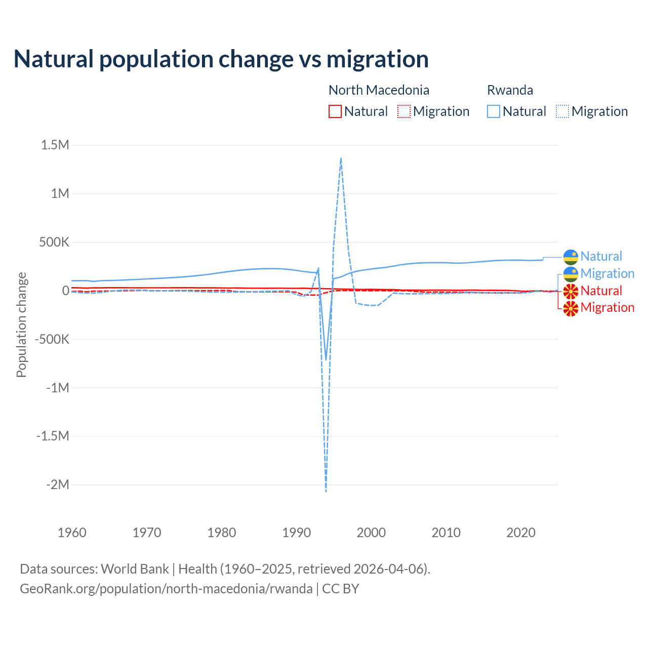 Over the last 10 years, 6.45% of the population change in North Macedonia is from natural causes (a loss of 12,585 people) and 93.5% is from migration (a loss of 182,429 people). In Rwanda 93.8% is from natural causes (a gain of 3,081,296 people) and 6.18% is from migration (a loss of 203,035 people).