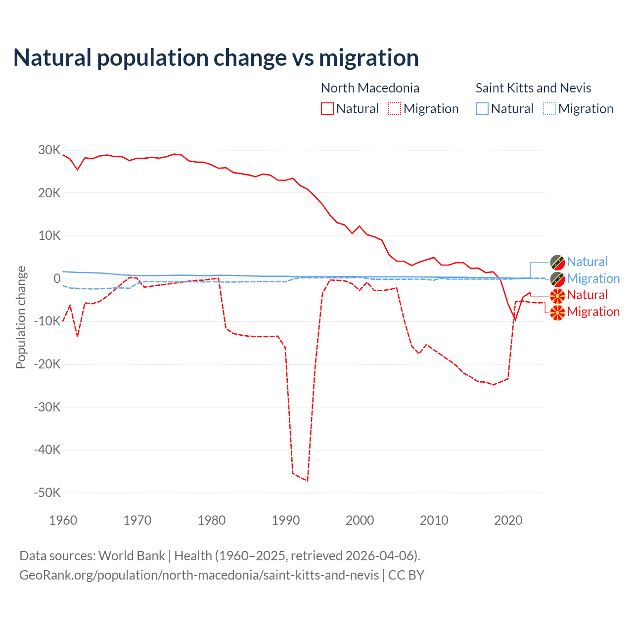 Over the last 10 years, 6.45% of the population change in North Macedonia is from natural causes (a loss of 12,585 people) and 93.5% is from migration (a loss of 182,429 people). In Saint Kitts and Nevis 44.9% is from natural causes (a gain of 1,225 people) and 55.1% is from migration (a loss of 1,506 people).