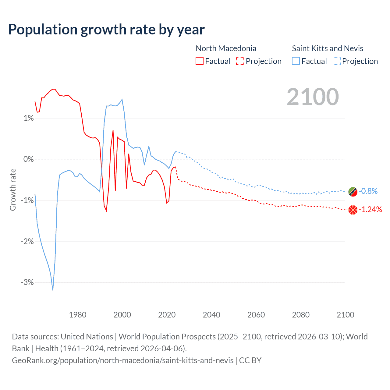 - For the last 10 years, North Macedonia has had an average growth rate of -0.48% per year vs -0.04% in Saint Kitts and Nevis.