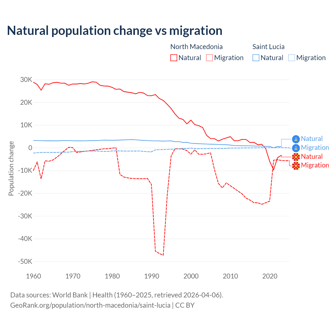 Over the last 10 years, 6.45% of the population change in North Macedonia is from natural causes (a loss of 12,585 people) and 93.5% is from migration (a loss of 182,429 people). In Saint Lucia 95.7% is from natural causes (a gain of 6,039 people) and 4.31% is from migration (a loss of 272 people).