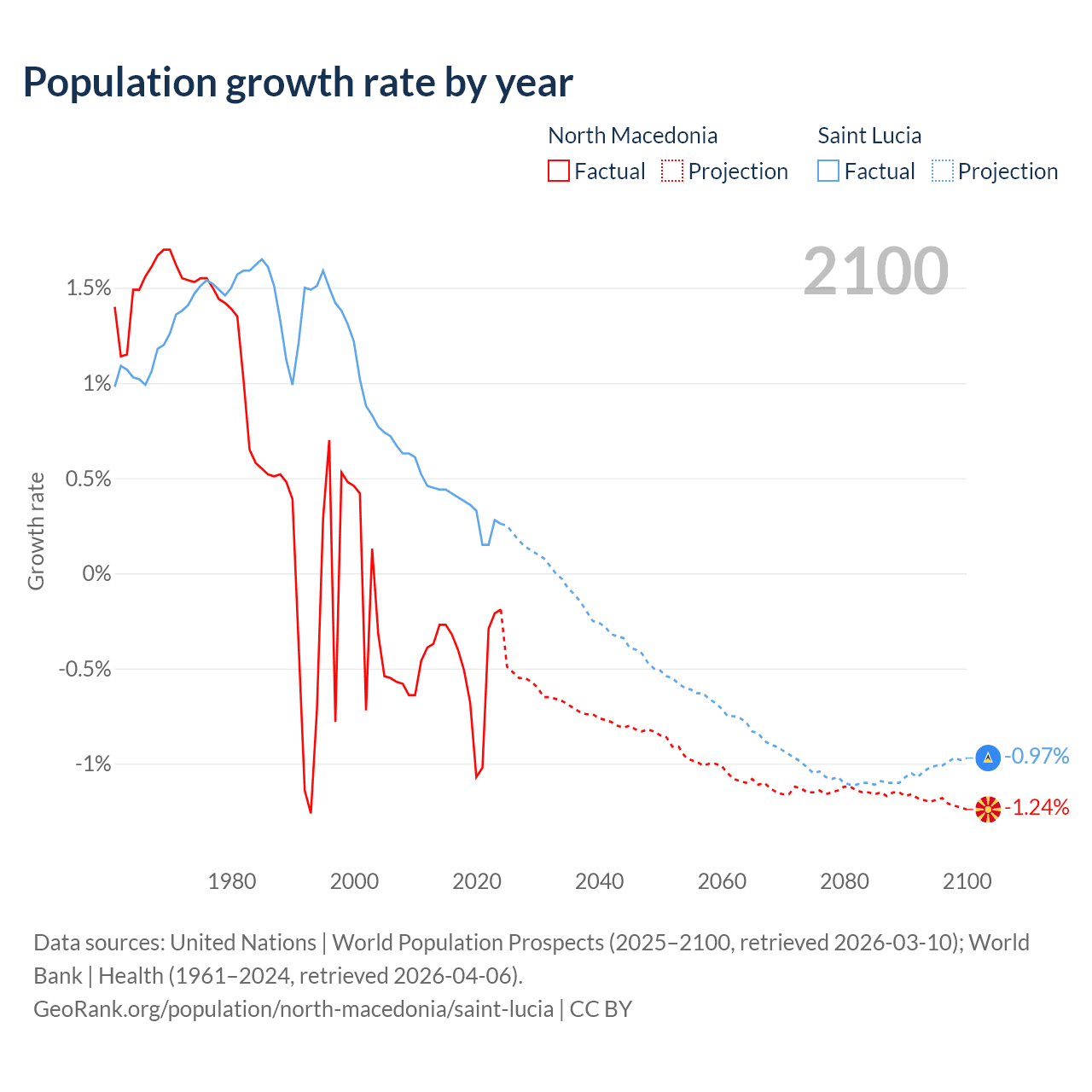 - For the last 10 years, North Macedonia has had an average growth rate of -0.48% per year vs +0.33% in Saint Lucia.