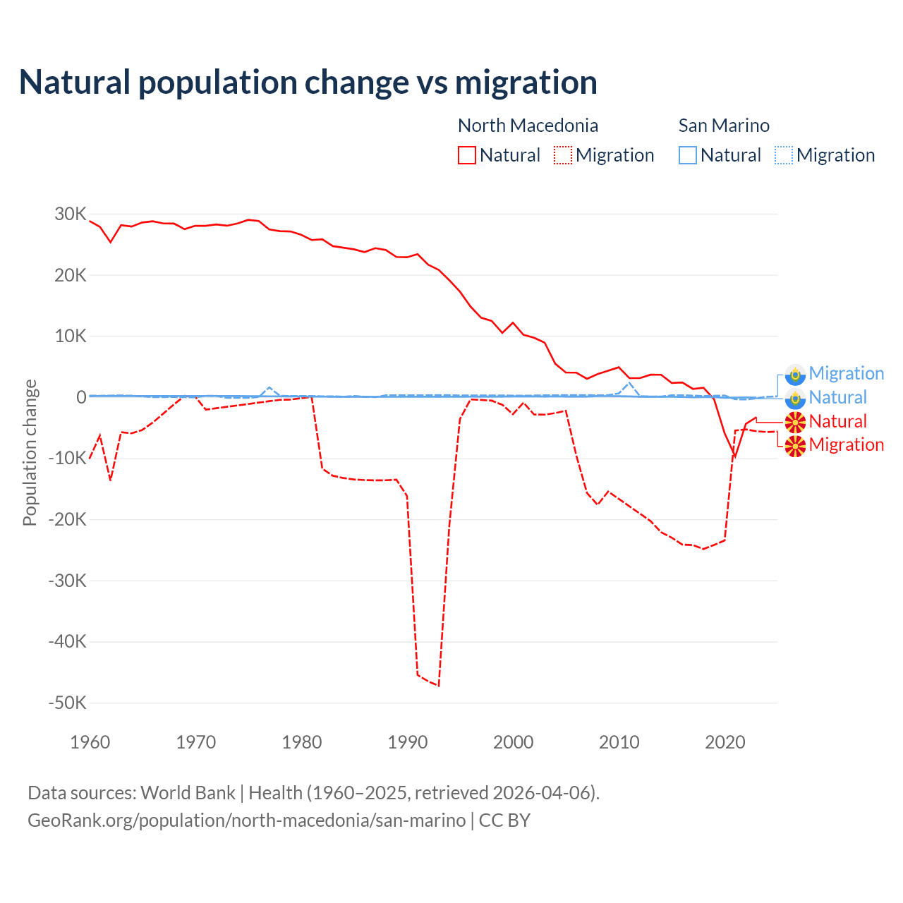 Over the last 10 years, 6.45% of the population change in North Macedonia is from natural causes (a loss of 12,585 people) and 93.5% is from migration (a loss of 182,429 people). In San Marino 40.9% is from natural causes (a loss of 358 people) and 59.1% is from migration (a gain of 517 people).