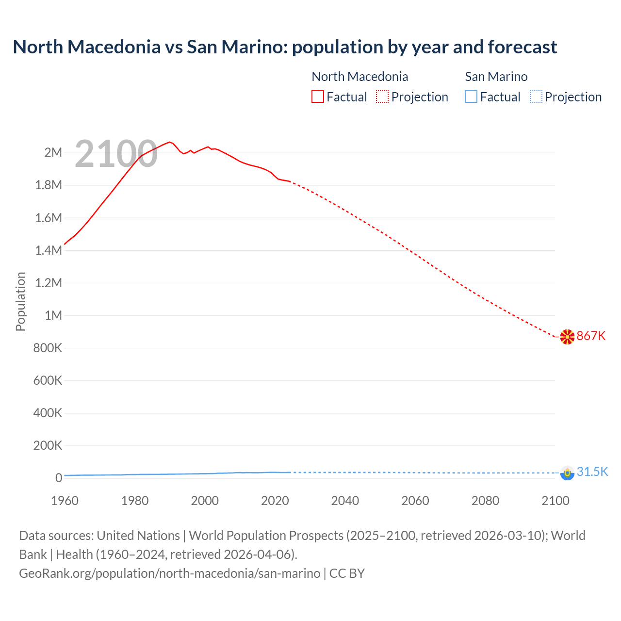 North Macedonia vs San Marino: population by year and forecast