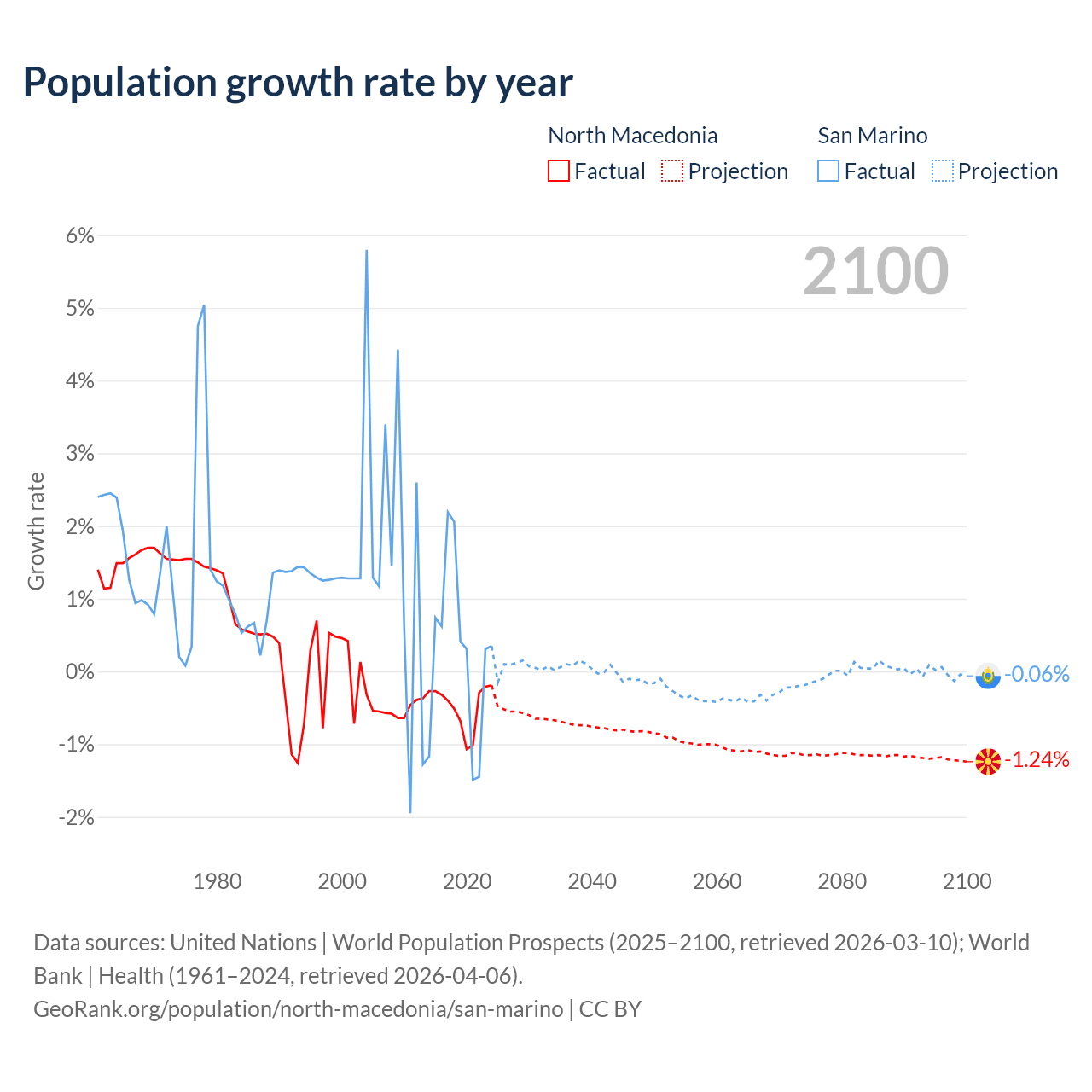 - For the last 10 years, North Macedonia has had an average growth rate of -0.48% per year vs +0.26% in San Marino.