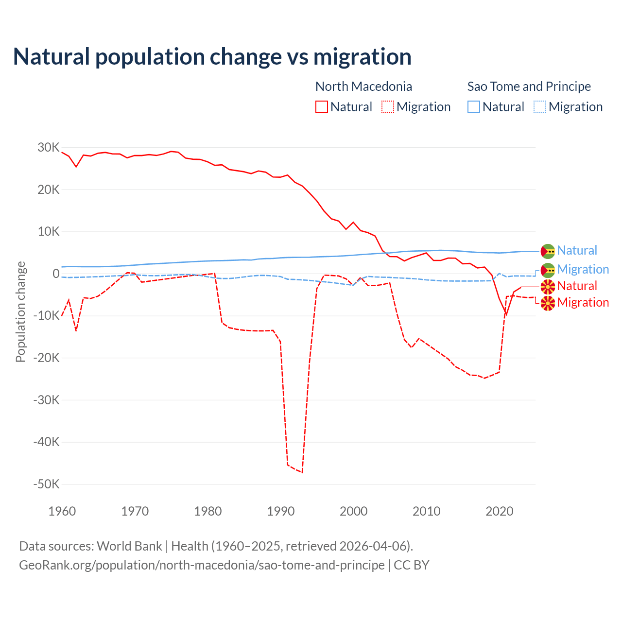 Over the last 10 years, 6.45% of the population change in North Macedonia is from natural causes (a loss of 12,585 people) and 93.5% is from migration (a loss of 182,429 people). In Sao Tome and Principe 80.1% is from natural causes (a gain of 50,822 people) and 19.9% is from migration (a loss of 12,621 people).