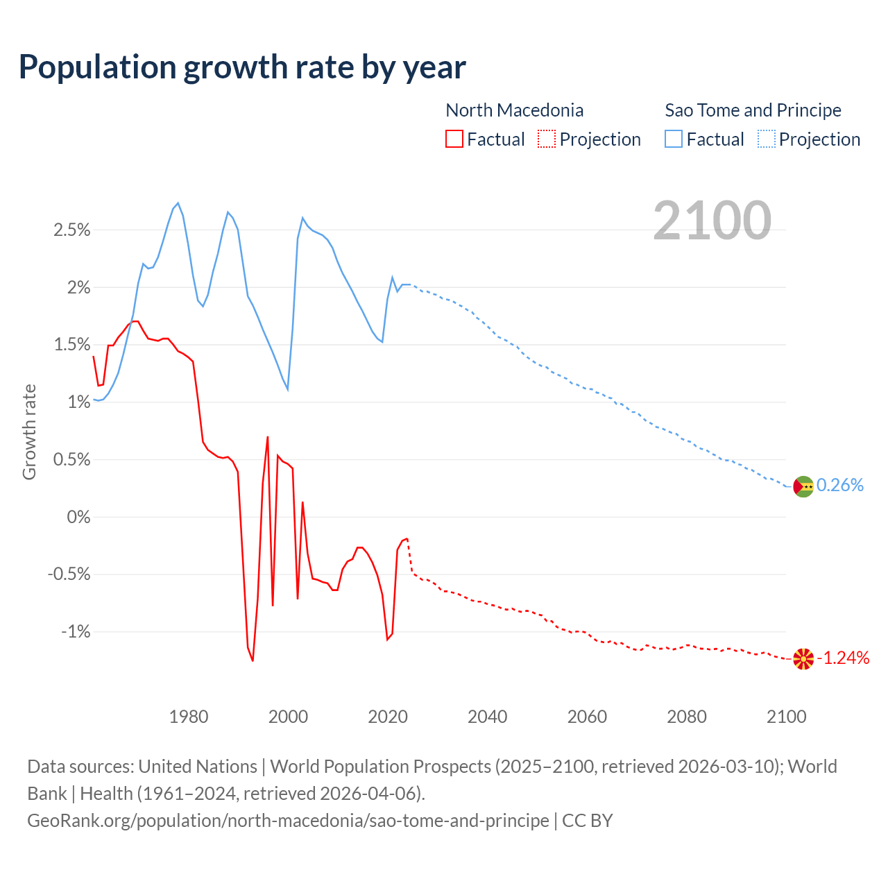 - For the last 10 years, North Macedonia has had an average growth rate of -0.48% per year vs +1.82% in Sao Tome and Principe.