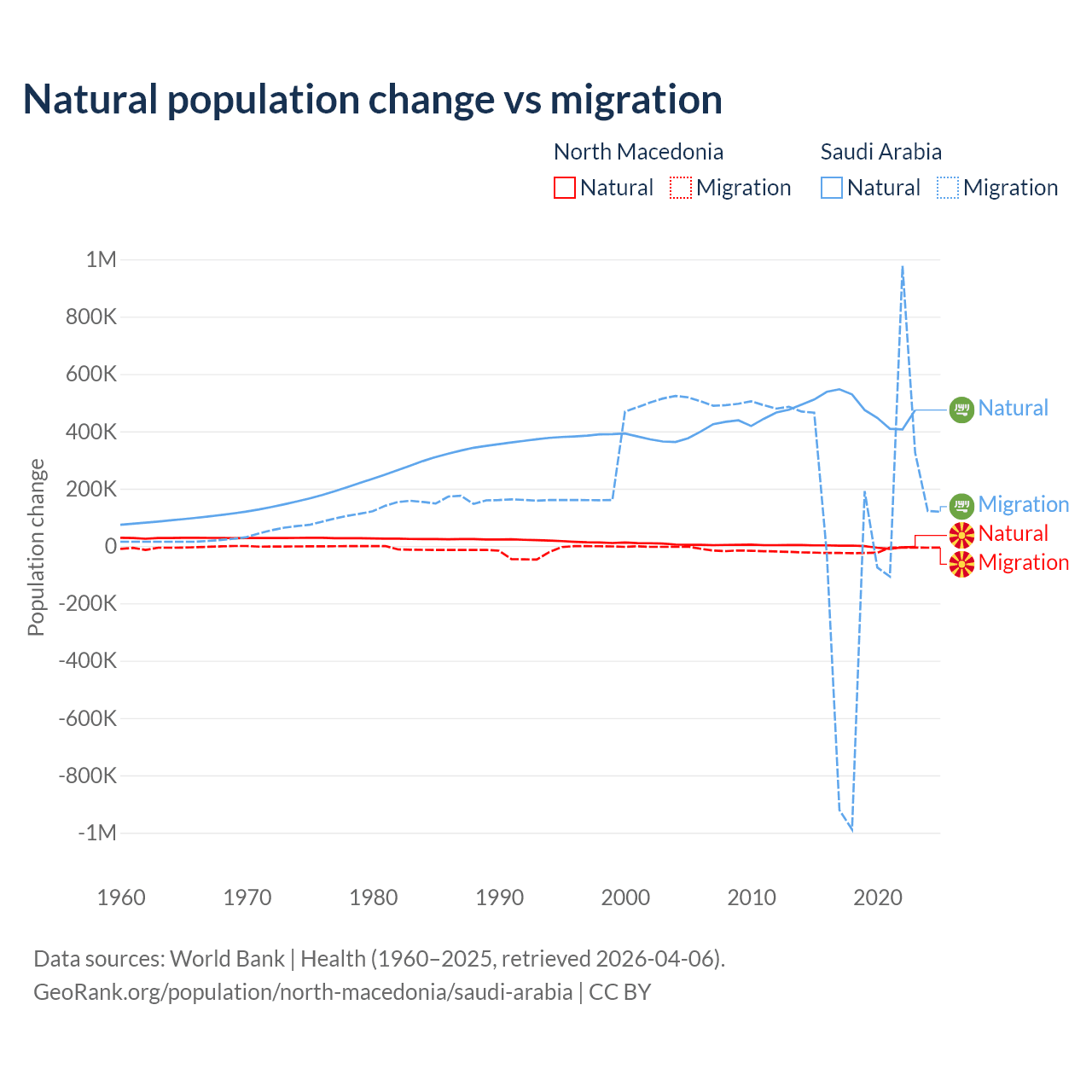 Over the last 10 years, 6.45% of the population change in North Macedonia is from natural causes (a loss of 12,585 people) and 93.5% is from migration (a loss of 182,429 people). In Saudi Arabia 93.9% is from natural causes (a gain of 4,829,562 people) and 6.05% is from migration (a gain of 311,209 people).