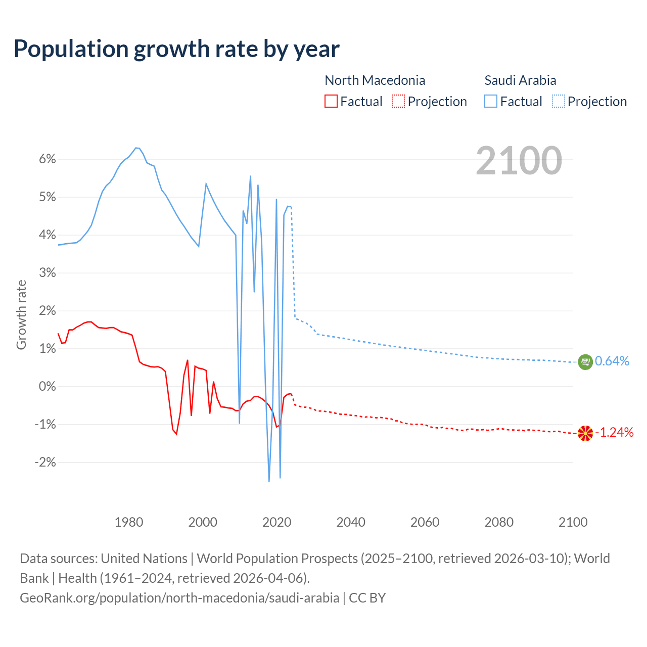 - For the last 10 years, North Macedonia has had an average growth rate of -0.48% per year vs +2.3% in Saudi Arabia.