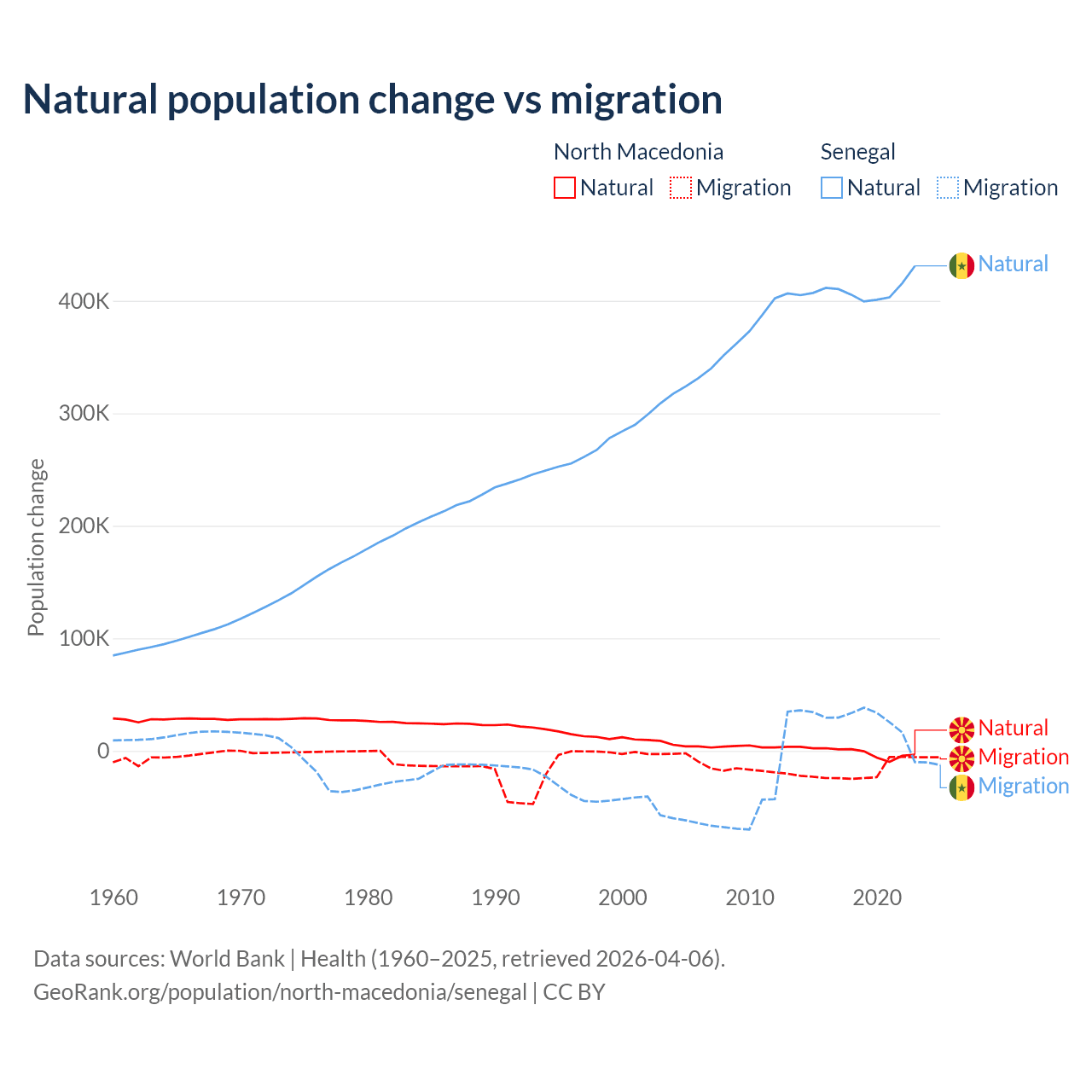 Over the last 10 years, 6.45% of the population change in North Macedonia is from natural causes (a loss of 12,585 people) and 93.5% is from migration (a loss of 182,429 people). In Senegal 93.9% is from natural causes (a gain of 4,089,205 people) and 6.13% is from migration (a gain of 267,266 people).